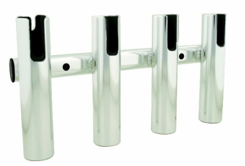 Brushed anodized Aluminum Rod Rack holds four rod and reel combinations. Slotted opening for reel handles offers secures storage and open bottom make this rod rack an ideal choice for longer spinning rods.. This rack is 16-Inch wide and 12-Inch high....